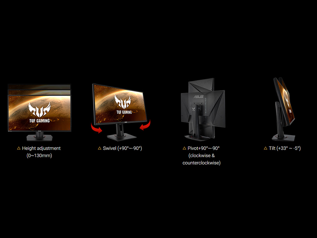 Ker je zasnovan za gaming, ima zaslon številne funkcije namenjene izboljšanju igranja. Podpira ShadowBoost, GamePlus, GameVisual, ponuja zmanjšanje modre svetlobe in zmanjšuje utripanje. Stojalo monitorja je ergonomsko in omogoča spremembo naklona, višine, obrat levo-desno ter tudi popoln zasuk monitorja za 90°, kompatibilen pa je tudi z VESA nosilci.