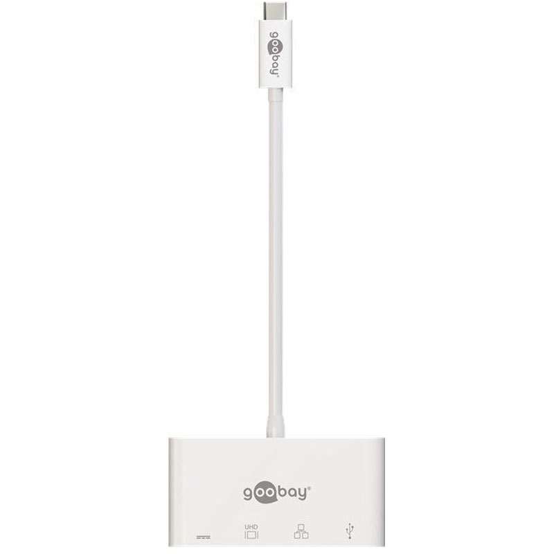 GOOBAY USB-C multi – adapter zrcali signal iz USB-C na Ethernet + in USB naprave. USB-C priključek za hitro polnjenje s prenosom podatkov do 5 Gbps. Podpira HDMI ločljivost do 4K x 2K @ 30 Hz. Funkcija polnjenja preko USB-C pri do 60W.