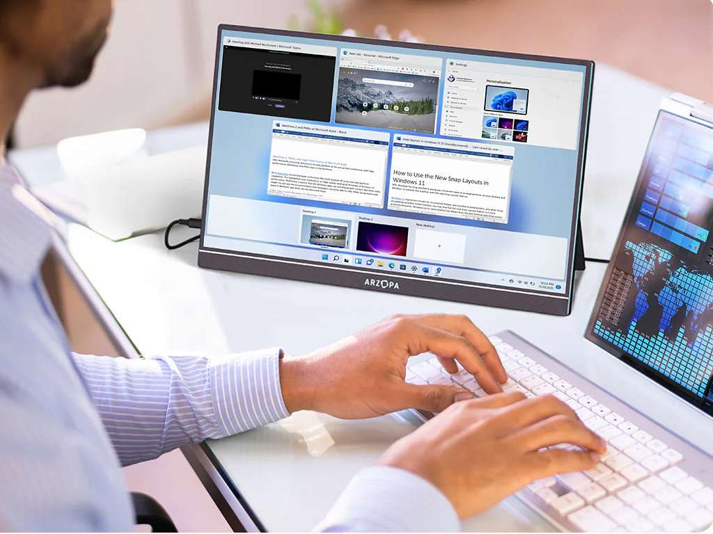 Arzopa A1M ponuja velik 17,3-palčni FHD IPS zaslon, ki prinaša jasne podrobnosti, žive barve in široke kote gledanja. Zaradi odličnega kontrasta in dobro uravnotežene svetlosti je idealen za delo na dokumentih, urejanje videoposnetkov, gledanje filmov ali igranje iger, kjerkoli ga potrebuješ.