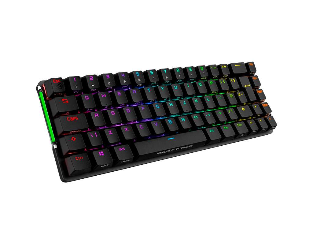 ROG Falchion je brezžična igralna tipkovnica v 65% velikosti standardne tipkovnice, a s (po)polno funkcionalnostjo. Ponaša se z interaktivno ploščico na dotik, inovativim pokrovom in brezžično Aura Sync RGB osvetlitvijo. Tipke so narejene iz vzdržljivega materiala PBT, NX Red stikala pa poskrbijo za natančnost in linearen odziv. ROG Falchion uporablja napredno 2,4 GHz povezavo s poročanjem vsako milisekundo in nudi do 450 ur delovanja baterije z enim polnjenjem.