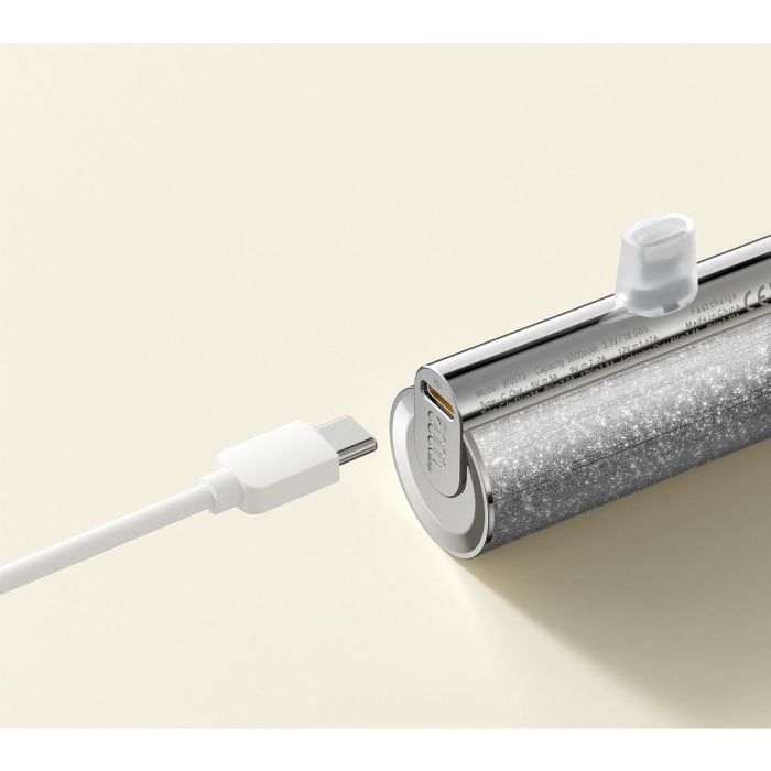 Powerbanka ima vgrajen USB‑C priključek, ki se neposredno poveže z napravo, zato dodatni kabli niso potrebni.